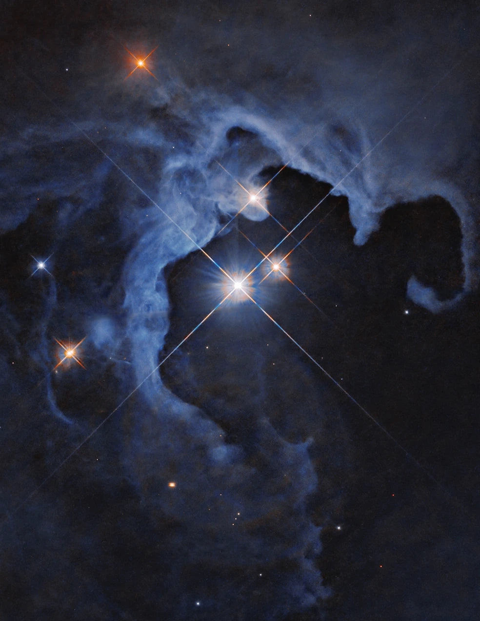 Unser Zweimonatsbild zeigt drei Sterne im Jugendstadium, die mit einem Alter von zehn Millionen Jahren ihre Kernfusion gerade erst begonnen haben. Dieser Prozess, bei dem unter Abstrahlung gigantischer Energiemengen Wasserstoffatome zu Helium verschmelzen, ist auch in unserer Sonne wirksam und schafft so die Grundlagen für irdisches Leben. Um diesen Vorgang zu starten und in Gang zu halten, ist das Sonneninnere bestens geeignet, herrschen hier doch extreme Druck- und Temperaturbedingungen. Umgeben ist das Trio von Gas- und Staubwolken, die nicht selbst leuchten, sondern von den Jungsternen blassblau beleuchtet werden. Dieses Bild wurde 2024 vom Weltraumteleskop Hubble gewonnen, das nach wie vor in Betrieb ist, obwohl sein Nachfolger, das James-Webb-Teleskop, mittlerweile seit über zwei Jahren eigenen Forschungsprojekten nachgeht. Immer noch erscheinen jährlich 1000 wissenschaftliche Veröffentlichungen, die auf Daten von Hubble beruhen. -