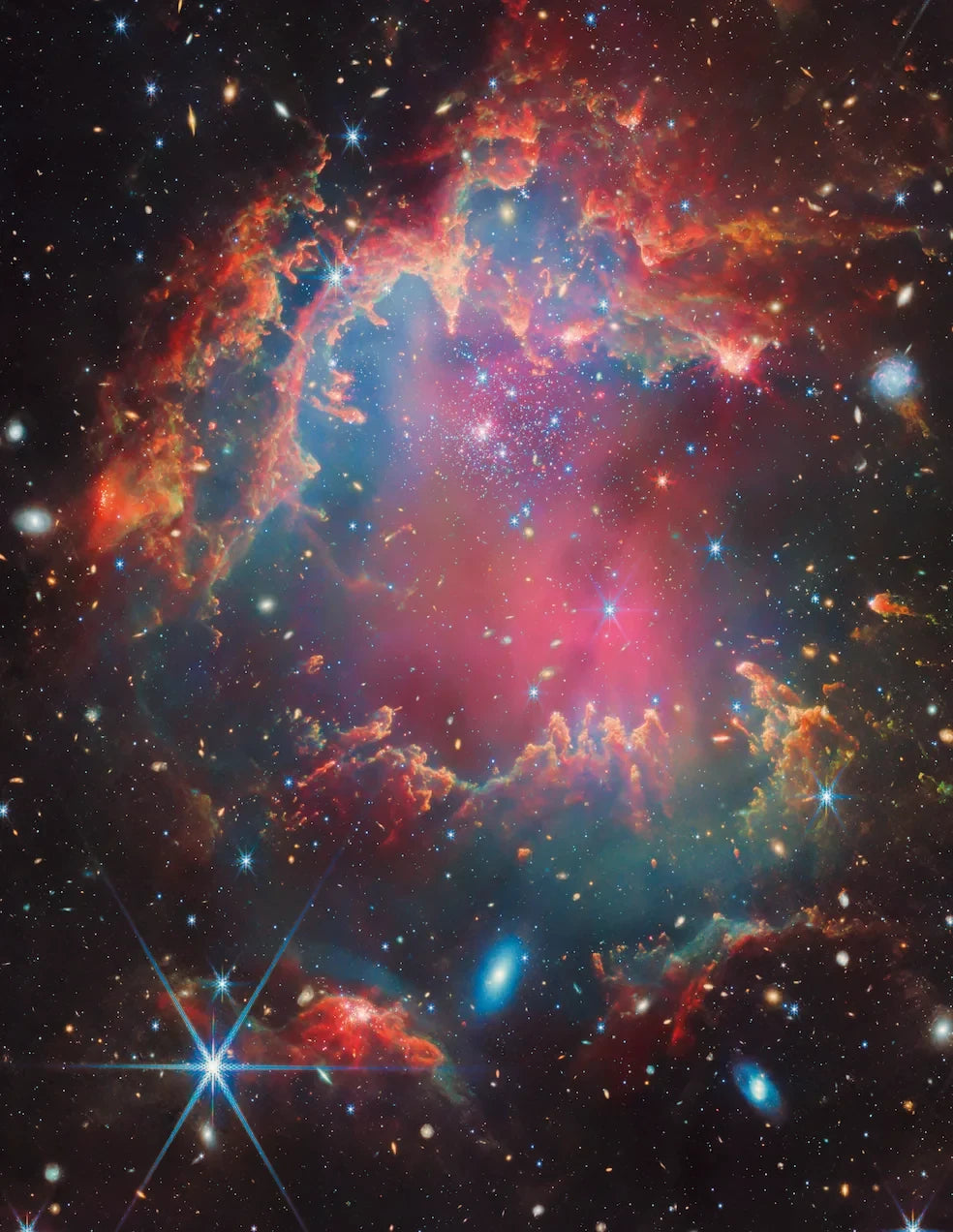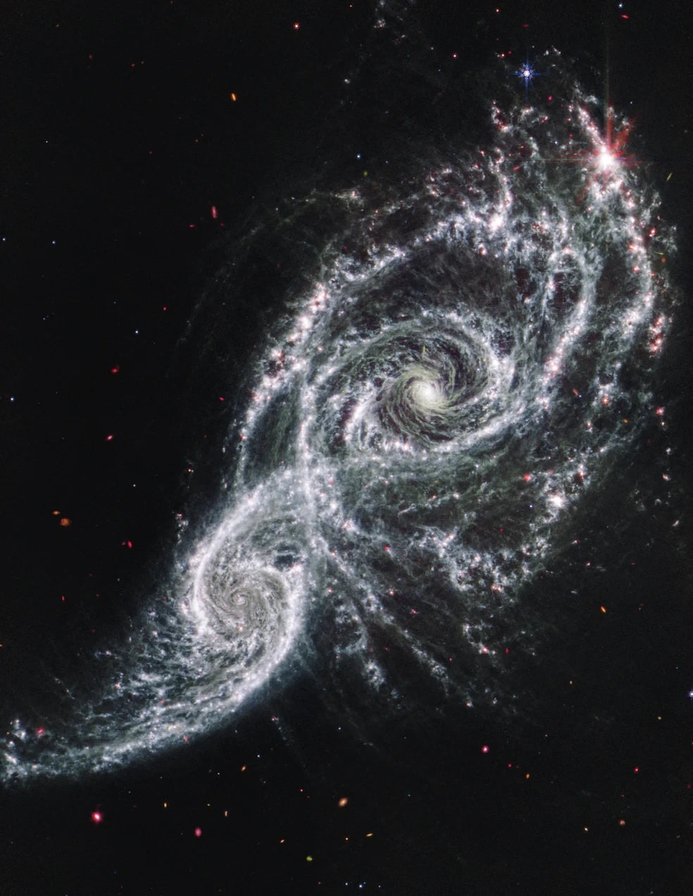 Das James-Webb-Weltraumteleskop versorgt uns seit Sommer 2022 mit spektakulären Bildern, hier die Kollision zweier Galaxien im Sternbild Großer Hund, das unseren winterlichen Nachthimmel ziert. Den spektakulären Begriff Kollision kann man ruhigen Gewissens auch durch Verschmelzung ersetzen, da die Astronomen davon ausgehen, dass sich beide Galaxien über einen Zeitraum von einer Milliarde Jahren vereinigen werden. Zudem sind die kosmischen Räume innerhalb der beiden Milchstraßensysteme riesig. Würden wir uns diesen vielleicht 100 Millionen Lichtjahren entfernten Galaxien nähern, die Fachleute sind sich über die Entfernung unsicher, könnten wir den Anblick allerdings nicht so wie abgebildet genießen. Die Aufnahme gibt einen Eindruck in den Wellenlängen des mittleren Infrarots wieder, für das unsere Augen nicht empfänglich sind. Damit lassen sich vor allem interstellare Wolken, in der Abbildung weiß, studieren. Viele der rötlichen Objekte außerhalb der beiden fernen Welten erscheinen elliptisch. Dies ist kein Fehler in der Optik des Webb-Teleskops, vielmehr bilden sich hier Galaxien des unendlichen Weltalls ab. -