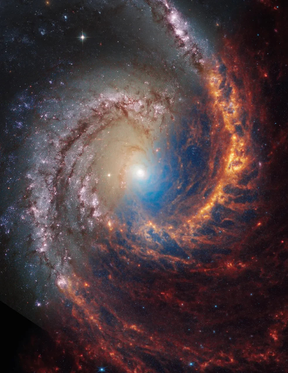 Dieses Bild ist eine Fotomontage derselben Spiralgalaxie, die von den beiden Weltraumteleskopen Hubble und James-Webb aufgenommen wurde. Links oben der Anblick im sichtbaren Licht und im UV-Bereich, gewonnen durch das erdnahe und immer noch funktionsfähige Hubble-Teleskop. Hier liegt der Fokus auf den gleisend hellen, heißen Sternen und den interstellaren Dunkelwolken. Rechts unten die Aufnahme des James-Webb-Teleskops, das mit seinen Infrarotempfängern wesentlich genauer die energiearmen Gas- und Staubstrukturen abbilden kann. Und in der Mitte das galaktische Zentrum mit Millionen stellarer Objekte, die auch das gut verborgene Schwarze Loch überstrahlen. Die Astrophysiker gehen mittlerweile davon aus, dass in praktisch jeder Galaxie ein solches alles absorbierendes Schwarzes Loch aufzufinden ist.